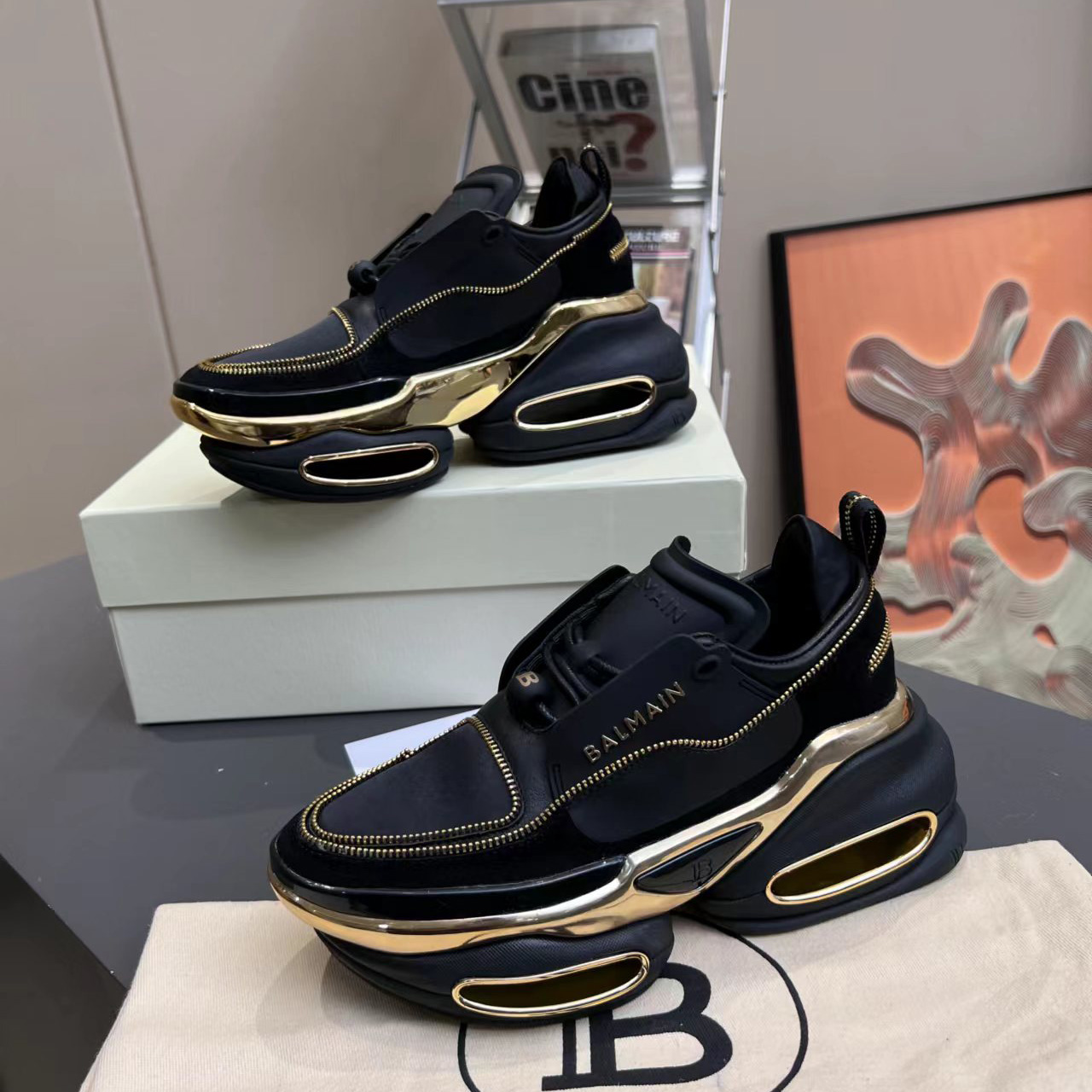 Black laces on top, thick black platform soles, openworked areas with outline on the sole, gold-tone panel with embossed Balmain logo