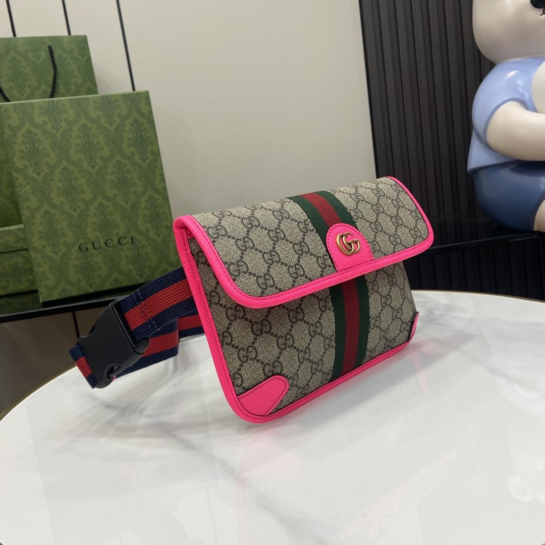 Reflecting the Creative Director's contemporary vision, the Ophidia lines come to life with a pop of fluorescent fuchsia. Combining the GG motif and Web stripe with a modern hue launches signature travel pieces into the metropolis, such as this small belt bag.