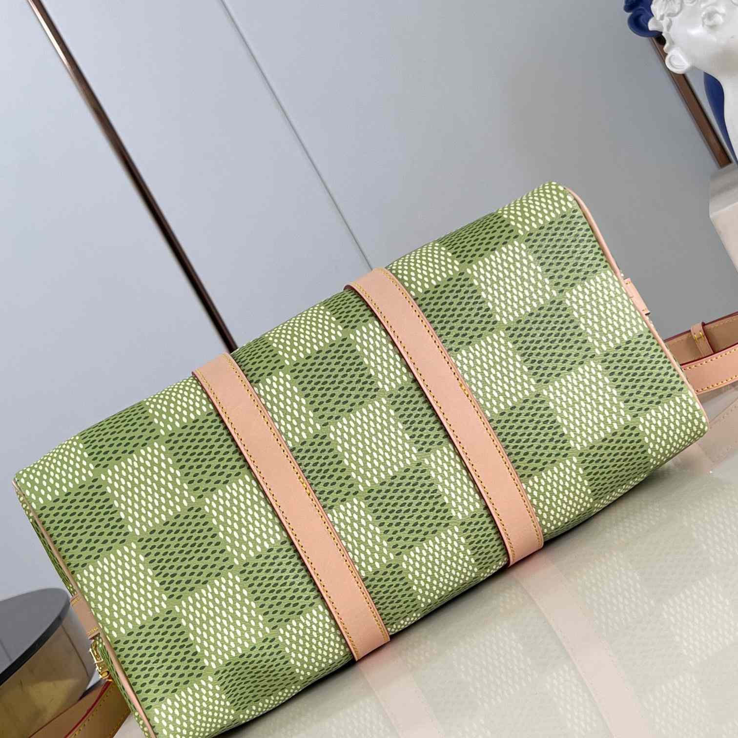 Part of the collaboration with Tyler, this Keepall Bandoulière 35 is fashioned from Damier Golf coated canvas and trimmed with pale cowhide leather. The green colorway is perfectly complemented by the pink Louis Vuitton flower charm and the “L.Vuitton Marque Déposée,” also in pink, in the one of the Damier squares.