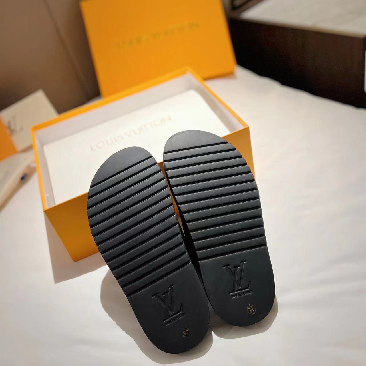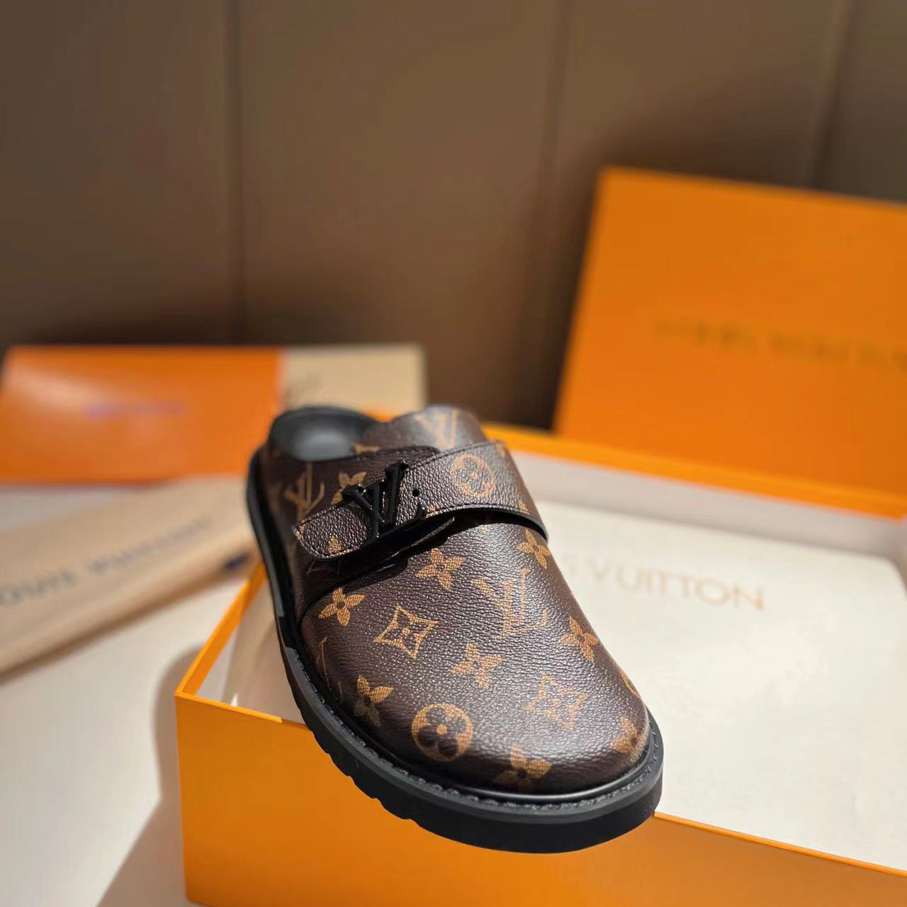 The LV Easy mule is an on-trend, slip-on style in Louis Vuitton's iconic Monogram canvas. The strap on the upper is embellished with an LV Initials accessory, while fluorescent stitching highlights the welt. This model features a comfortable anatomic insole and a micro rubber outsole for enhanced resistance to slips and wear.