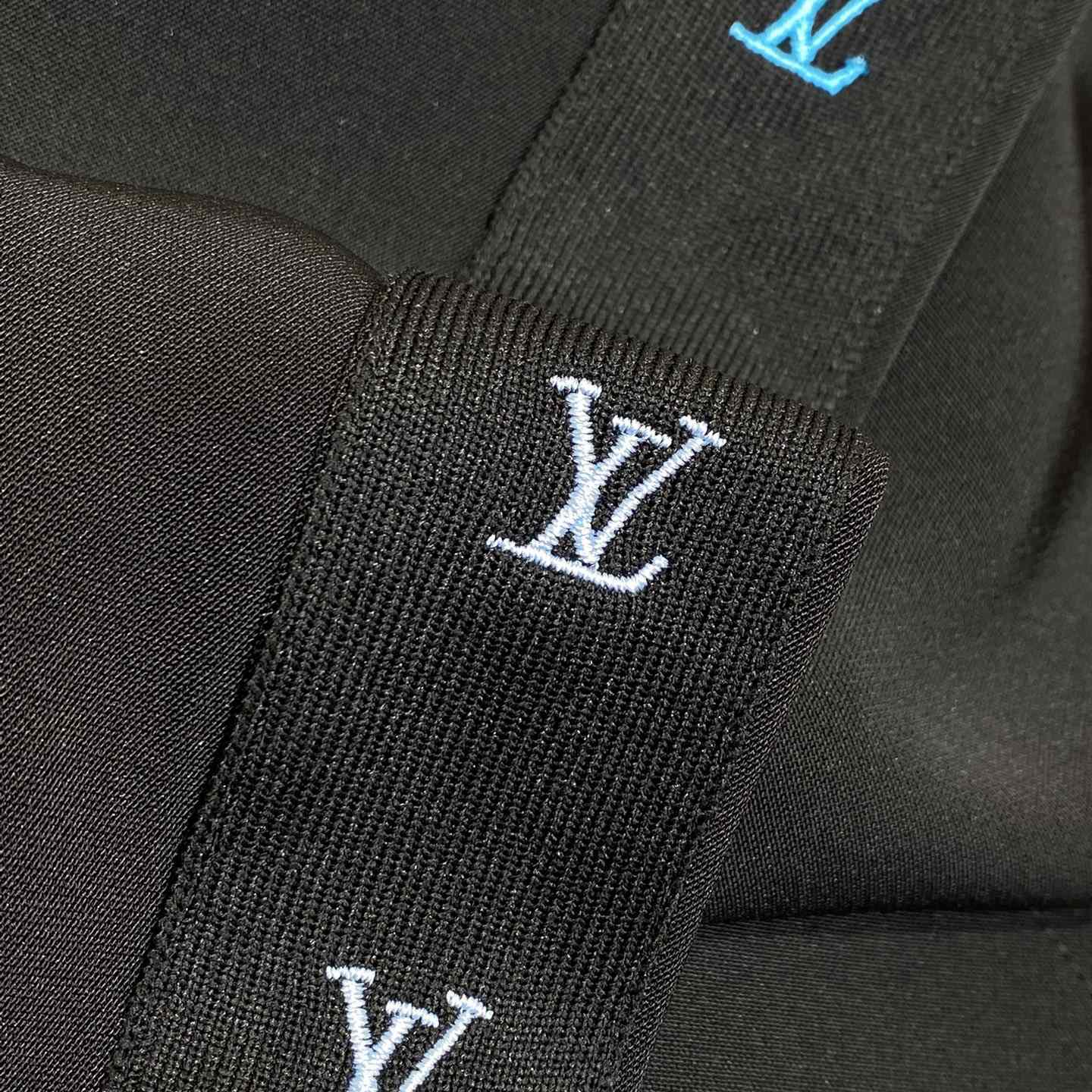 These black jersey pants offer a sporty take on tailoring. Cut from wool-blend jersey, they have an elegant pleated front, while bands down the outside of each leg are adorned with embroidered LVs in a colorful gradient effect. This smart piece can be paired with a matching blazer for a modern preppy look.