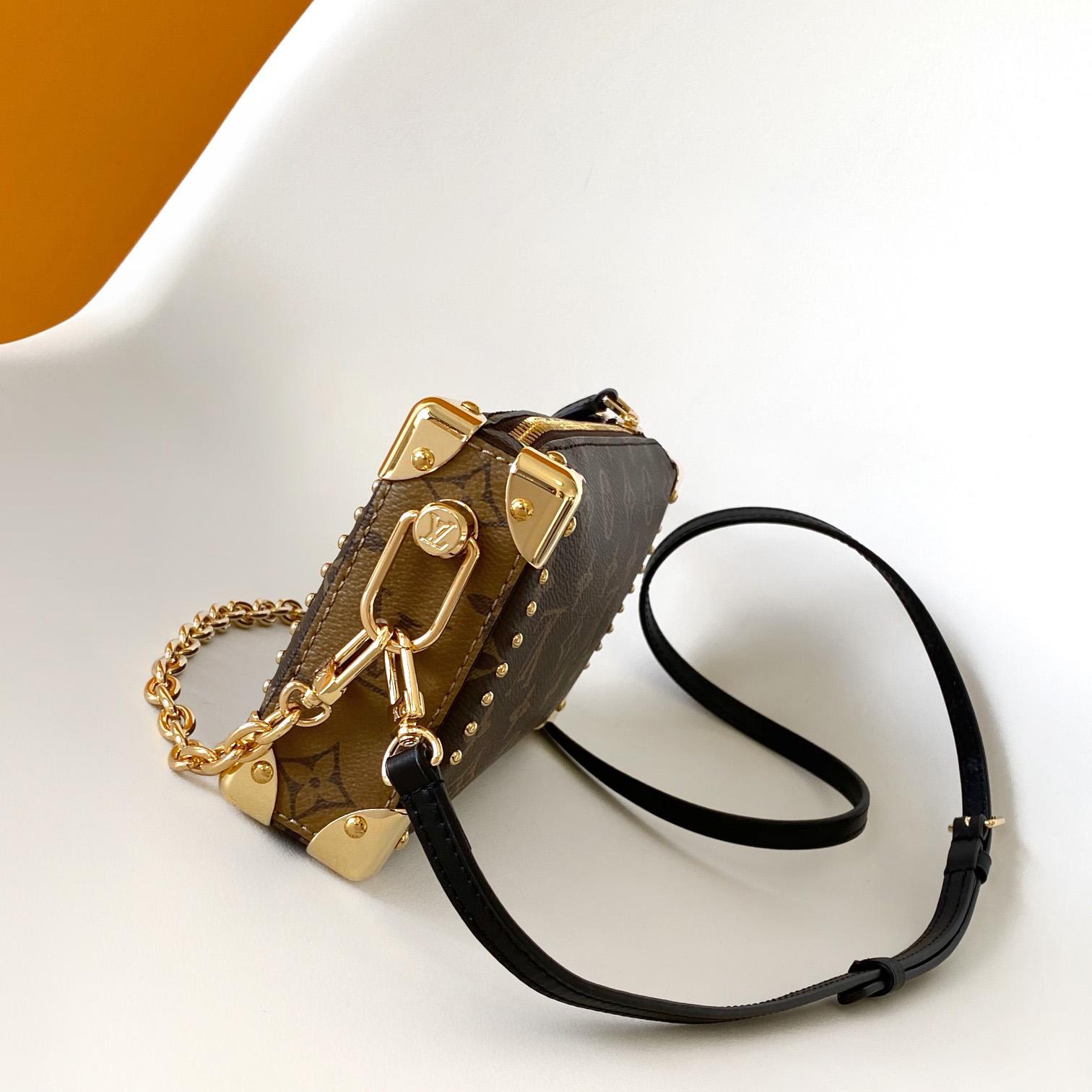 For the season, the iconic Trunk family is reinterpreted with a chic addition: the Slim Trunk. As seen on the Cruise 2025 runway, this elegant handbag showcases Nicolas Ghesquière’s signature, mixing Monogram and Monogram Reverse with smooth cowhide trims. Emblematic details, such as the gold-tone S-lock and metallic studs, highlight the rich history of the emblematic Trunk story.